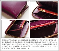 TAKOスライダー付きラウンドジッパー、TAKOスライダー付きジッパー式小銭入れ×1、札入れスペース×2、ポケット大×2、ポケット小×2、カードポケット×12